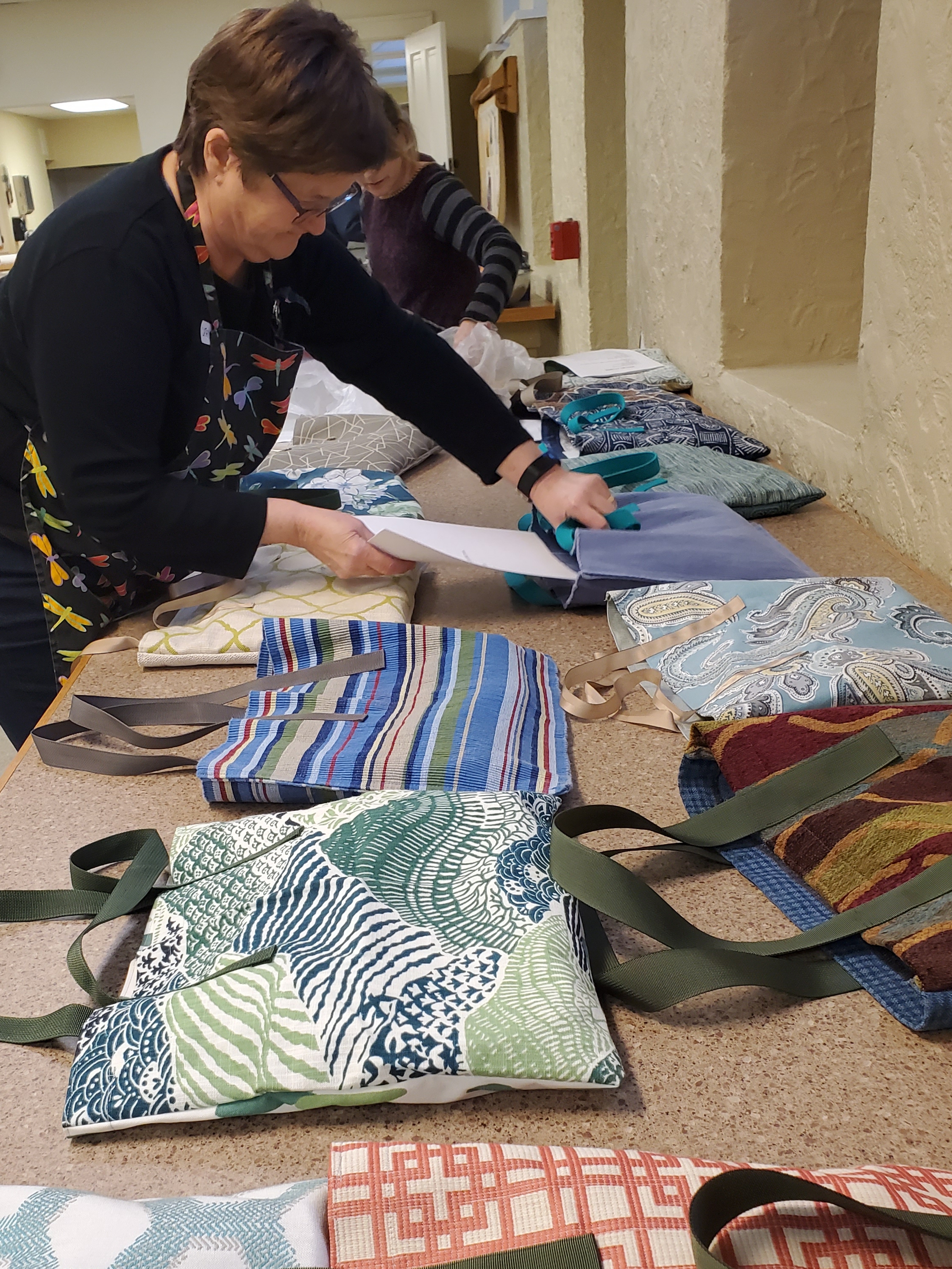 Volunteers at other tables packaged ingredients in single recipe portions and filled cloth bags, sewn by a community volunteer as gifts for the students. At the end of the evening, the bags would include all of the day’s recipes, as well as the ingredients each cook would need to prepare the foods at home during the week.