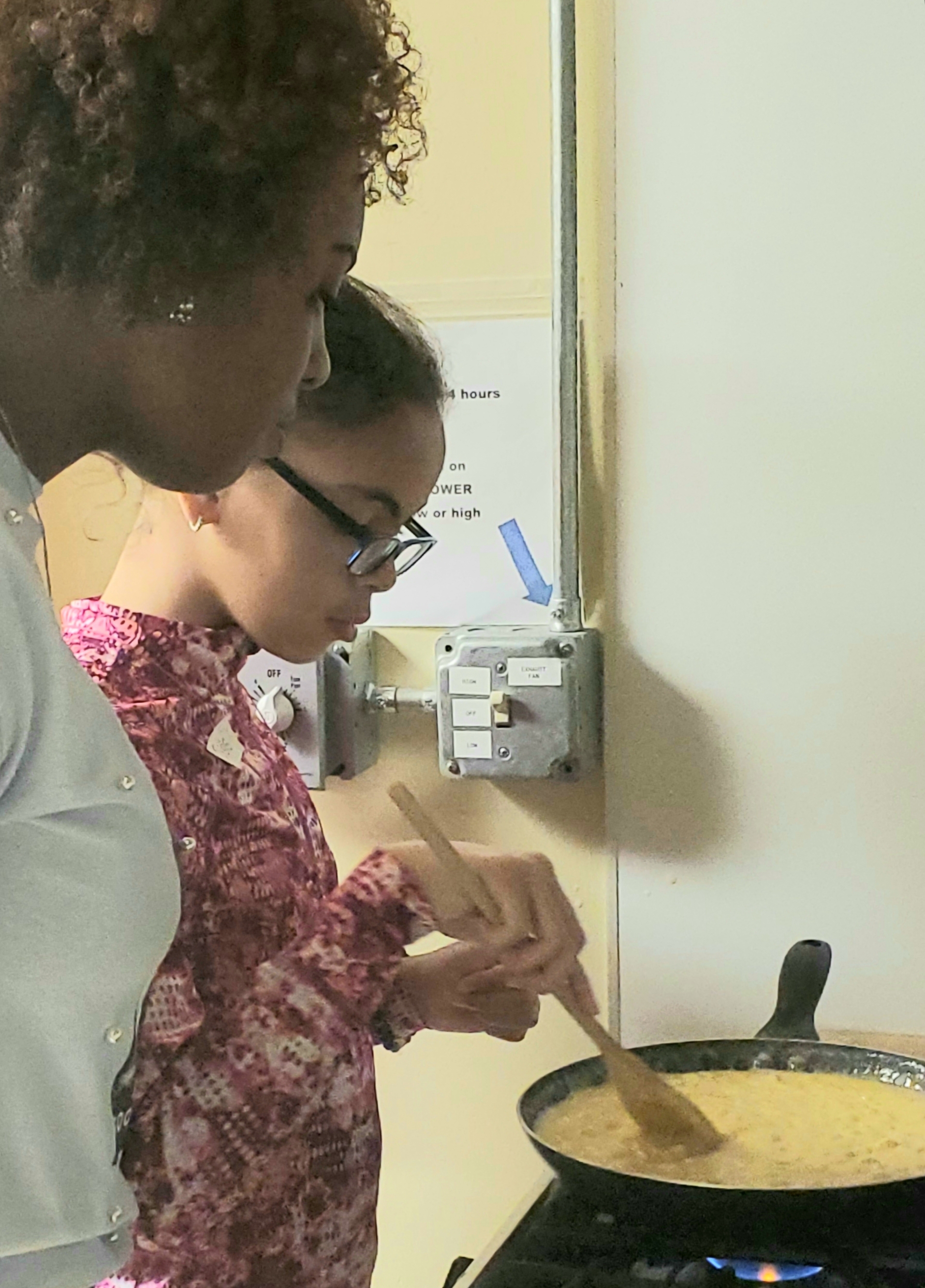 On one such Tuesday, I watched a group of students gathered around a table participating in food group activities. Eve, a community volunteer and owner of Martha Merrell’s Books, integrated literacy concepts into her lesson, which also included recognizing cooking terms and reading a recipe. Across the room, another group put their skills to practical use, working together to read an apple fritter recipe, paring and dicing apples, measuring and mixing ingredients to make batter, frying fritters and dusting them with powdered sugar. Cathy, an adult volunteer, ensured that everyone had a chance to participate in each step, taught them safe handling of cooking tools and techniques, and offered samples to the young chefs.