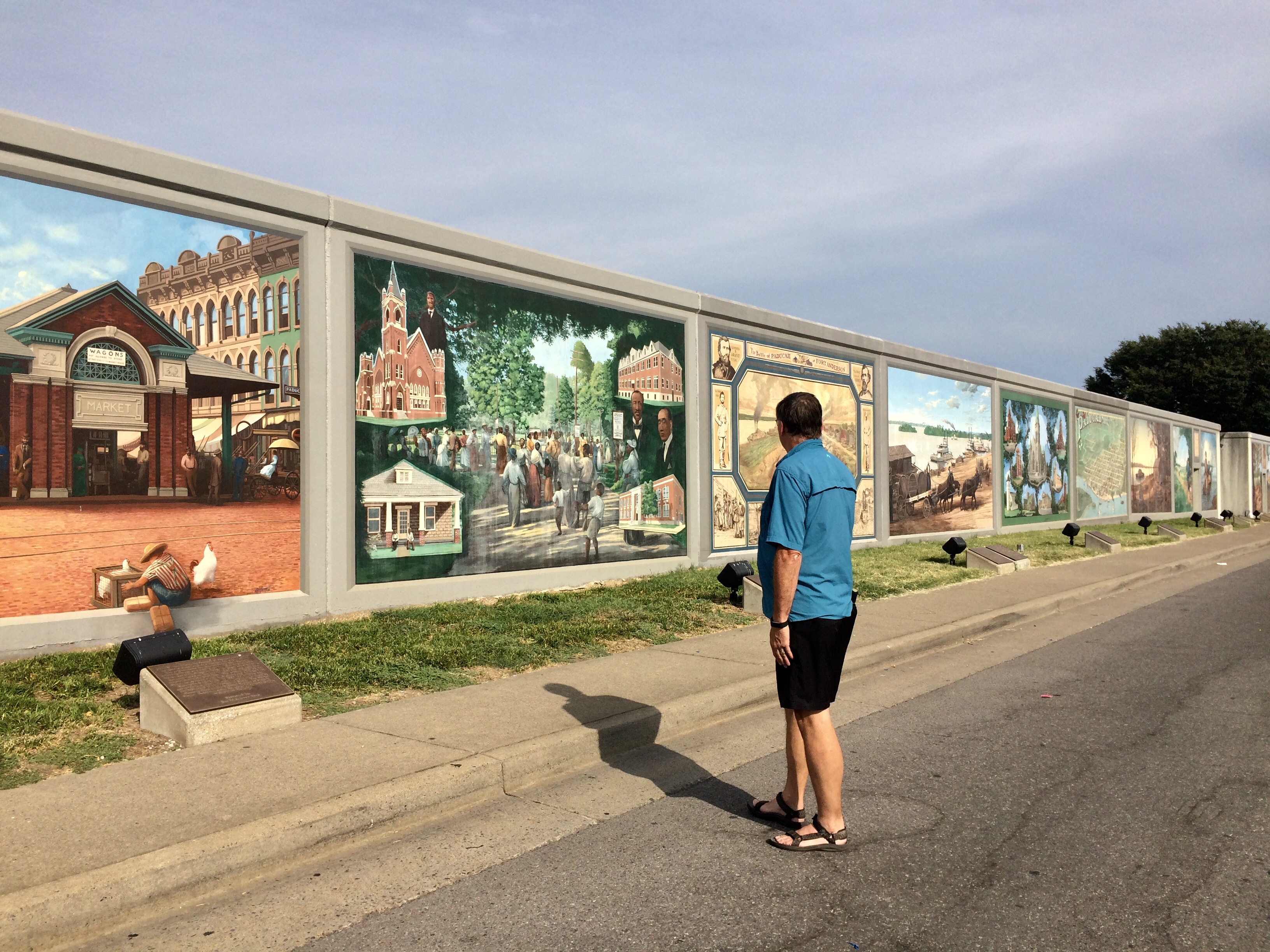 Gene looks at historical murals covering the sea wall in Paducah, KY