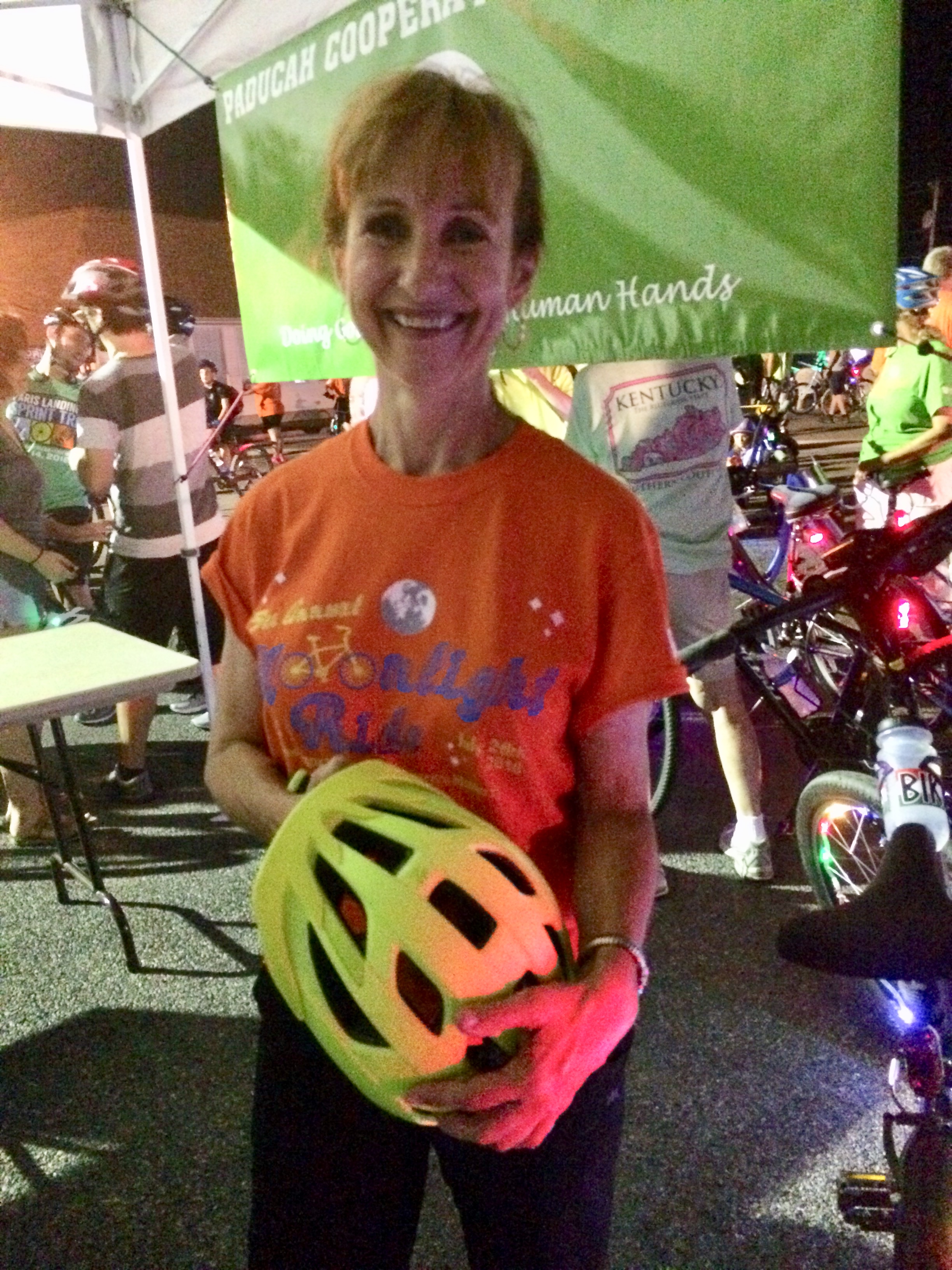 648 riders set off at 10 PM under a nearly full moon, bicycles decked out in colorful lights. Our dollar store light sticks were no match for the new-fangled LED strings of bicycle wheel lights adorning many of the local two-wheelers. We weren’t in a hurry, but we probably packed more conversation into ten miles than any of the rest! We arrived home a week later to several packages from Kenneth – new flashing tail lights, flashlights and handlebar mounts, and four sets of multicolored bike wheel lights. I bet Kenneth and Lottie might be the first two registered for next year’s ride!