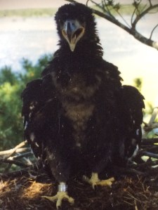 Chuck went on to explain that he’d make two flights over each nest in the spring of each year: one to find out which nests had eagle pairs incubating eggs, and a second time to determine how many of the eggs hatched. Then, when the eaglets reached the right age, he would locate the trees on foot, don spiked lineman’s boots and climb as high as 125 feet to band the young eagles. “About three weeks old was the best time to band,” he explained. “Earlier than that, their feet could slip right out of the bands. But any later, and they’re harder to catch. Sometimes the babies hopped right out of the nest onto the tree branches and a few  even tried to fly!”