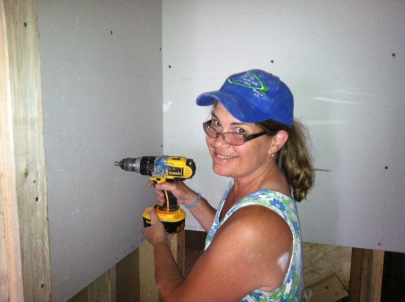 Barb hanging drywall in the bedroom closet