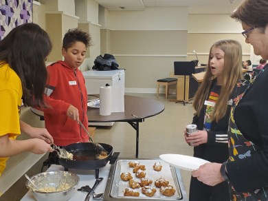 On one such Tuesday, I watched a group of students gathered around a table participating in food group activities. Eve, a community volunteer and owner of Martha Merrell’s Books, integrated literacy concepts into her lesson, which also included recognizing cooking terms and reading a recipe. Across the room, another group put their skills to practical use, working together to read an apple fritter recipe, paring and dicing apples, measuring and mixing ingredients to make batter, frying fritters and dusting them with powdered sugar. Cathy, an adult volunteer, ensured that everyone had a chance to participate in each step, taught them safe handling of cooking tools and techniques, and offered samples to the young chefs.